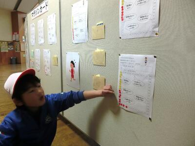 業間マラソン 投稿: 副校長 (13:10) 音楽が聞こえてくると 子どもたちは慌てて外へ飛び出します。 業間マラソン開始です! どの子もそれぞれ目標を立て、 自分の目標に向かって走ります。 先生方も、一緒に走ります☆ 走り終えると、どの子も意気揚々とシールを貼っています!